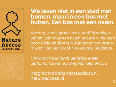 Mijn naam is Jos Bregman, en ik ben kunstenaar, standplaats Almere. Laatst kwam ik in contact met Josefien, de klimaatburgemeester van Gouda. Ik vertelde over een van mijn performances en ze vond dat het enorm goed aansloot bij Buurtgroen Gouda en ze bracht me in contact. Op hun uitnodiging heb ik me ook aangemeld op Buurtgroen Gouda - al woon ik in Almere - en mag ik wat over mijn performance vertellen. De performance heet Het Groot Nederlands Stadsbos en het is een grote omdenkoperatie, een groots eerbetoon en een open uitnodiging.